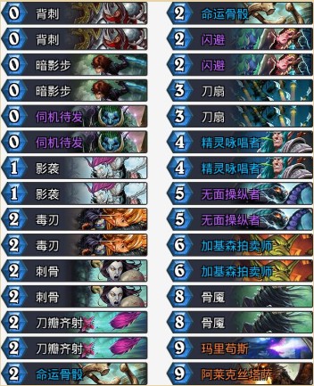 这套是蓝龙贼,卡组的思路很简单,用精灵咏唱者过滤随从,把蓝龙双无面摸到手上就可以了。其次刀瓣、影袭,刺骨等牌随便来两张都能超过30血斩杀,前期还有红龙可以直接打15血,配合斩杀,经过实验牌序顺的话5费不要基本就赢了。