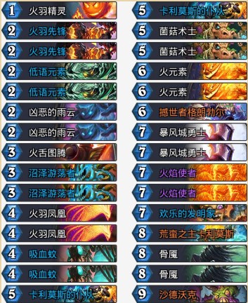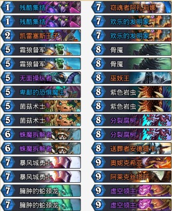 这套术士很简单,利用的就是战吼和亡语两个关键词的随从,这里不一一列举作用了,相信仔细理解卡组的小伙伴都懂。起手我们优先找能战场的亡语随从,其次再去找BUFF,疯狂铺场就好了,打盗贼稍微防一下刀扇,没有手牌就抽。这里有好几个随从是橙卡,如果没有的小伙伴可以替换成:夜刃刺客、袋鼠宝宝、退役冠军等等有战吼正面效果的随从。最后,值得一提的是蛛魔我们如果有一定要带上,我们本身是没有法术的,那么可以卡主蓝龙贼的节奏,蓝龙贼清理场面是非常难的,蛛魔能为我们争取1~2个回合就很不错了。