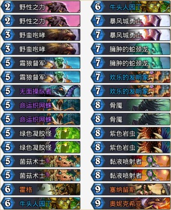超生德卡组相比铺场术的上限是更高的,通过高强度的BUFF进行全体属性的强化,乱斗卡组解场能力都很差的,我们如果开局拿到了一点优势就可以直接铺起来打脸,同为铺场卡组如果来解场必输。这里塞纳留斯、园丁、菌菇、织网蛛、野性之力暴风城等等都是BUFF类的。而铺场类特意增加了霍格、凝胶怪等等牌进行有效铺场,防止卡手情况。