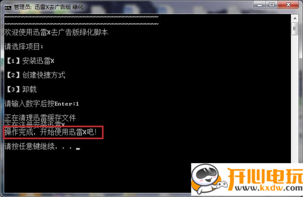 2.输入数字“1”,点击键盘上的“enter”键,等待一下,看到提示“操作完成,开始使用迅雷x吧!”,点击回车键