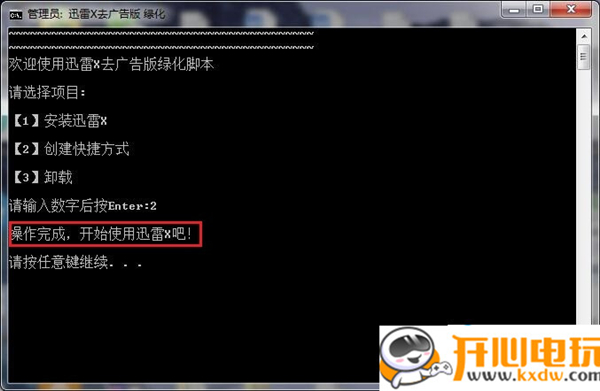 3.输入数字“2”,按“enter”,等待提示“操作完成,开始使用迅雷x吧!”,桌面就会生成迅雷的快捷方式,就可以开始使用了