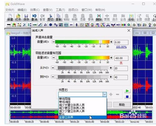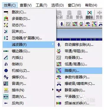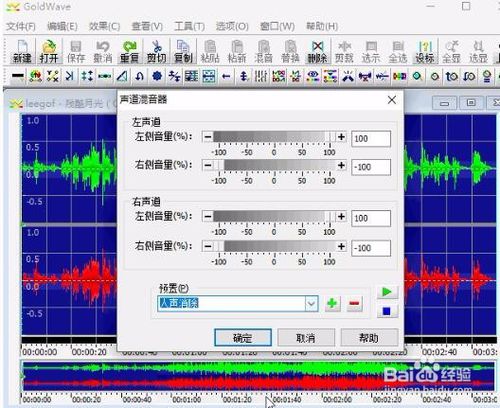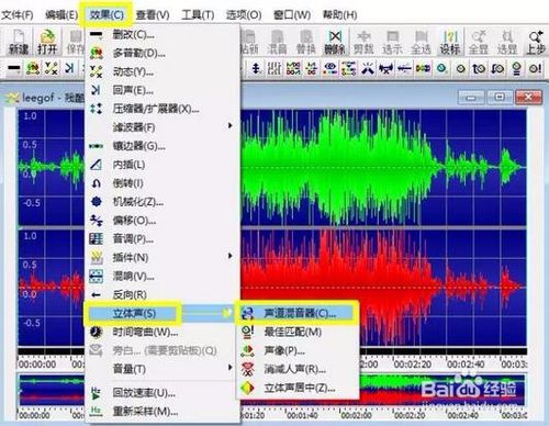 可以通过效果-立体声-声道混合器,设置声音音效,去除立体音、杂音等