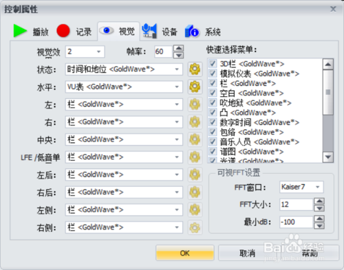 * GoldWave允许使用很多种声音效果,如:倒转(Invert)、回音(Echo)、摇动、边缘(Flange)、动态(dynamic)和时间限制、增强(strong))、扭曲(warp)等;