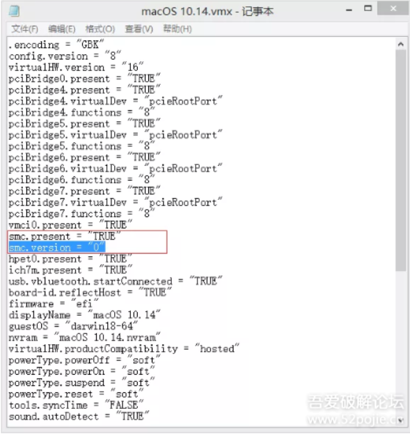 六 、 我们需要修改虚拟机的配置文件,此配置文件位于虚拟机的安装目录下,找到***.vmx结尾的文件后,用记事本打开,在smc.present = “TRUE”后面添加smc.version = 0,保存 后退出,再重新启动虚拟机。未出现错误的话进入下一步开始正式安装!