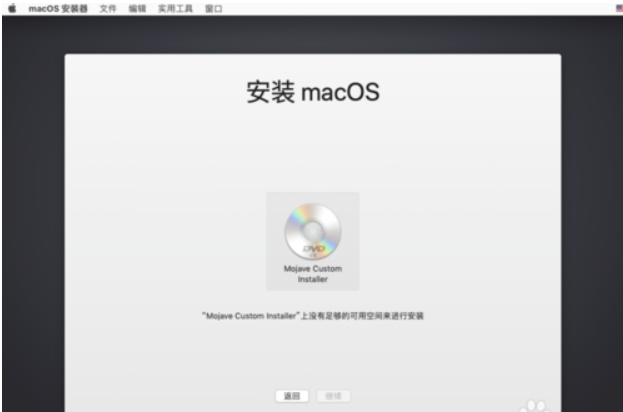 七、 进入macOS安装步骤,当进入以下磁盘选择页面时提示没有足够空间