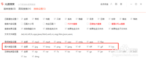 第一,光速搜索可以查找图片类型文件,图片包括jpg,bmp,png,jpepeg,tif,tiff,gif,ico这些类型。