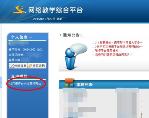 2、成功登陆后,会有各种课程列表和一些课程学习任务通知,根据个人需要来查看通知。