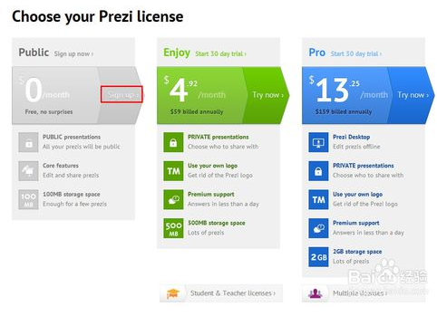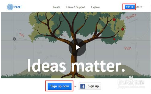 1、自行搜索关键词Prezi,进入Prezi官网,点击首页上的Sign up按钮。