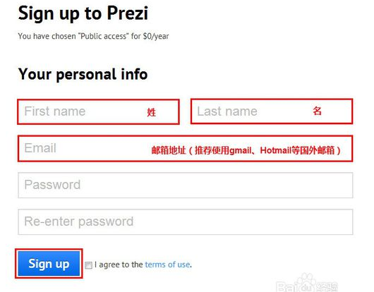 3、填写注册信息,输入自己的姓、名、邮箱、密码。为了更好的接收邮件,推荐使用国外的邮箱(Gmail、Hotmail),如果只有163邮箱、QQ邮箱,不用担心,完全没有问题的。
