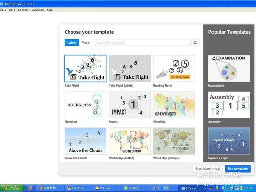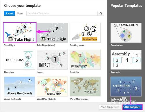 我们选择第一个Take Flight(起飞),然后选择Use template(应用模板),它左边灰色的选项是新建一个空白的Prezi;