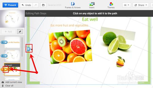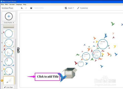 8、路径侧边栏。在这里你可以浏览演示稿在Prezi画布上的运动流程,也可以通过点击侧边栏最上边的图片显示整个Prezi画布。