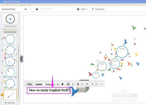 1、可缩放的Prezi空间。将您的文本、图片、视频放在Prezi画布上,您可以放大也可以缩小,Prezi也会帮助您在创作时定位一个合适的大小。