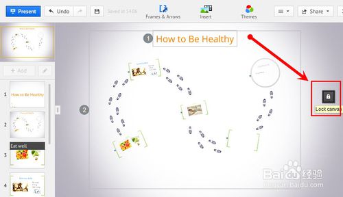 进入Prezi编辑页面,点击画布侧边缘中间的“小锁”解锁画布。(解锁完成后,可以通过鼠标滑轮实现画面的缩放和路径的编辑)