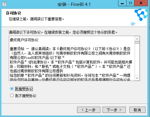 双击FineBI安装文件,会加载安装向导,安装向导加载完后,弹出如下对话框: