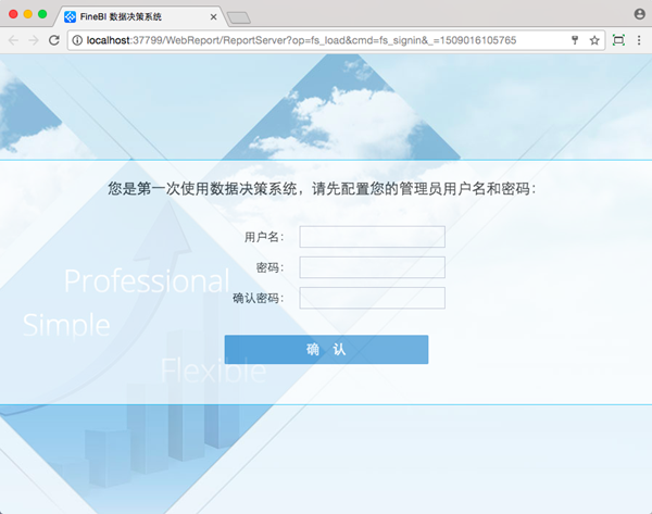 进入配置管理员用户名和密码界面,输入用户名、密码和密码确认,点击确认保存设置,会出现设置成功页面,如下图,点击登陆到数据决策系统即可登录成功。