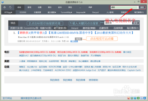在迅雷种子搜索器TSearch右上角搜索框输入关键词,点击搜索,关键词尽量简单,关键词越简单,搜索结果越准,例如“钢铁侠”,不要输入“钢铁侠 2013”这样的关键词。