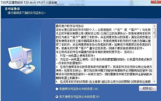 1、首先确保已经安装AutoCAD,点击运行T20天正建筑软件 V5.0,接受许可协议,点击下一步