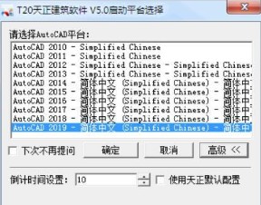 如果用户的机器安装了多个符合天正建筑软件使用条件的 AutoCAD 平台(包括 AutoCADArchitecture 等在内),首次启动时将提示在平台列表中选择,如下图左所示,单击“高级>>” 进入高级设置,如下图右所示。单击确定或者等待在“高级”中设定的倒计时后进入平台运行。