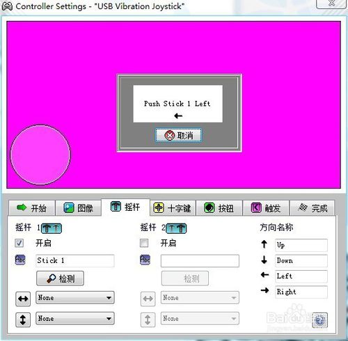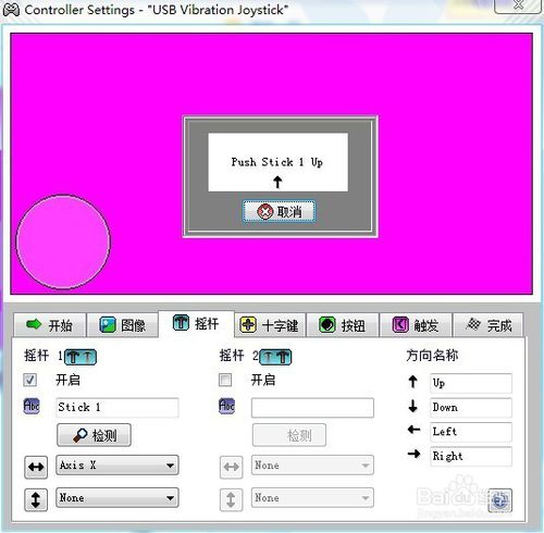 摇杆设置界面,点击摇杆后,开启前面打勾,就会出现图上所示,这个时候要把摇杆向左推,之后会让你把摇杆往上推(本人刚开始的时候不懂,以为这个只是确认摇杆的,就随便摇摇杆,结果摇杆的方向不正确),摇杆2也是一样的设置,有两个摇杆的就都打开,如果只有一个摇杆那就开一个摇杆,一会儿说明作用