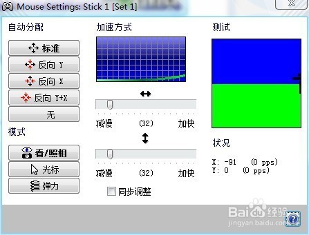 进入设置界面后,如图,图中的32代表移动速度,同步调整打钩后,开始调整速度,可边调边用手柄测试,直到习惯为止(不过习惯了键盘鼠标的,不可能那么快习惯手柄操作的)。之前讲到设置一个摇杆和十字键为鼠标,在设置鼠标速度的时候一个设置的慢点,用来在当前小地图操作,另一个速度设置的快点,用来看地图用(视角锁定党可以无视我这句话)。设置完成后关闭鼠标设置界面,返回按钮定义界面点击手柄小图标选择保存为就算完成了。文件保存后生成的XXX.xpadderprofile,是可以直接双击打开的,不需要再打开应用程序重新载入了,然后你就可以用手柄去玩LOL了。PS:该玩法娱乐用,因为手柄操作会相对的降低精准度,上手习惯比较困难,把手柄设置成双鼠标是为了减少手柄当鼠标使用所分享的误差