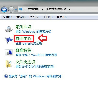 双击打开控制面板在右上角的搜索框中键入:索引→操作中心。