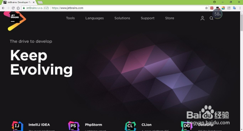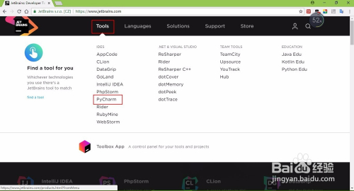 进入官网后,将鼠标放在tools选项卡上,然后点击pycharm选项,打开python详细介绍页面。