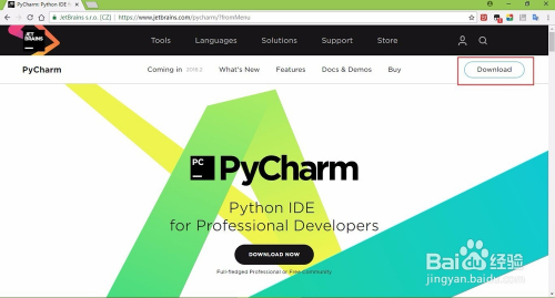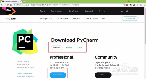 进入pycharm介绍页面后,点击图示框选download入口,进入下载页面,然后根据自己的机器系统,选择合适的IDE下载即可。