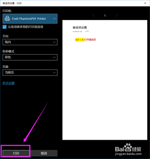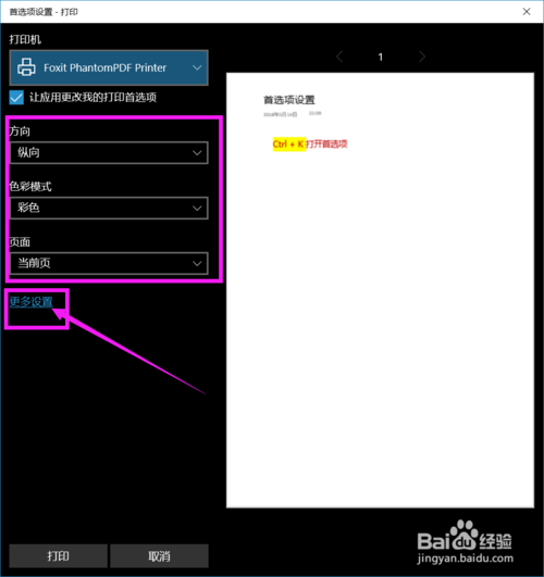 3、进入打印设置页面,可以设置打印的方向,色彩以及要打印的页面,还可以点击 更多设置