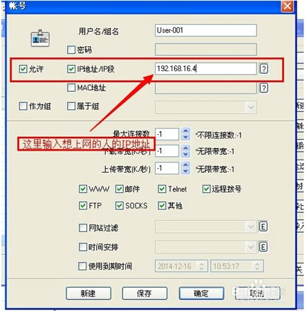 7、在点击“新建”按钮后弹出的“账号”对话框,需要勾选的选项默认,不需要更改,在“IP地址/IP段”右侧的框中填写要使你允许通过你的电脑代理上网的对方的IP地址,格式如:192.168.0.143;如果允许多台电脑,则多次操作第2-3步骤。