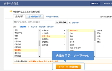 3.按照提示选择产品的类目,建议在搜索栏中搜索产品名称、搜索类目。