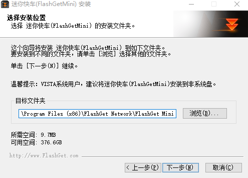 3、选择安装位置,默认是在C盘中,请选择硬盘剩余空间大于9.7M的盘来存放安装包