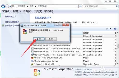 点击后就会提示“是否确认从本机上删除office 2003”,我们点击是。