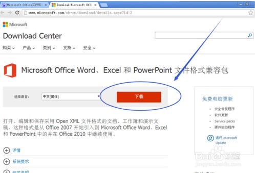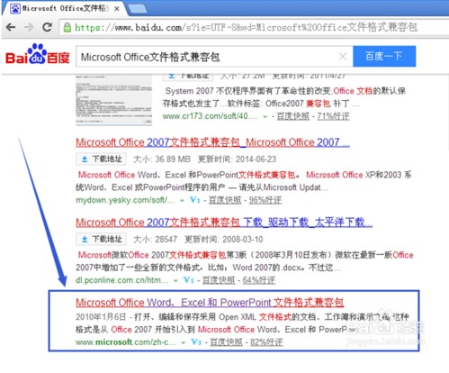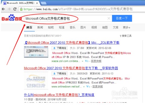 第一步,快速安装升级兼容包。在百度搜索“MicrosoftOffice文件格式兼容包”,按下回车键。