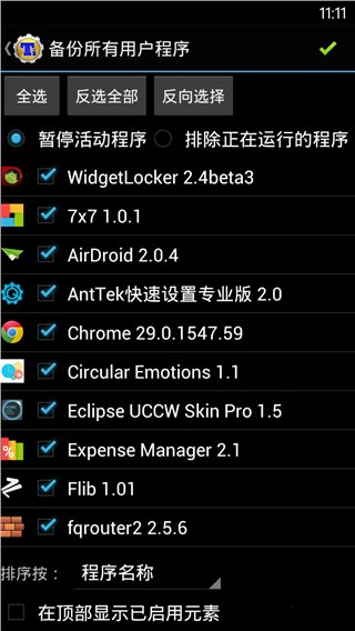由于是入门教程,笔者建议普通用户运行“备份所有用户程序”即可。随后,我们根据自己的需求勾选需要备份的软件,点击右上角“√”即可。同时,备份进度/结果会在通知栏实时显示。