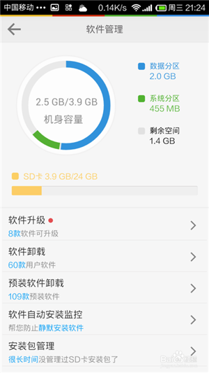 软件管理这块比较直接的显示了大体的目前使用情况和使用软件安装的位置,其实如果容量小的安卓手机真心要节约空间,完全不够用!