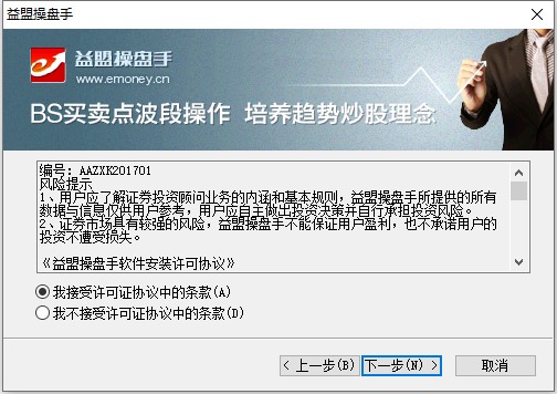 2、查看益盟操盘手协议,选择我接受,并点击下一步