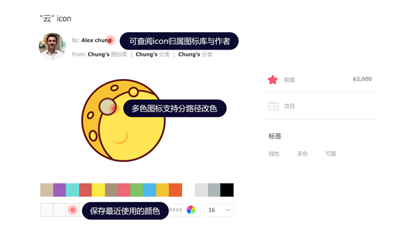 下载详情页:可查阅icon归属图标库与作者,多色图标支持分路径改色,下载图标自动保存最近使用的颜色