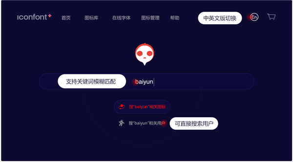 搜索:支持关键词模糊搜索,可以搜图标搜用户,中文 / English / Ping yin 无缝互译