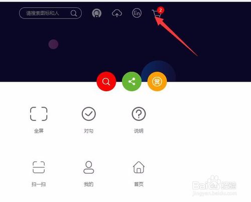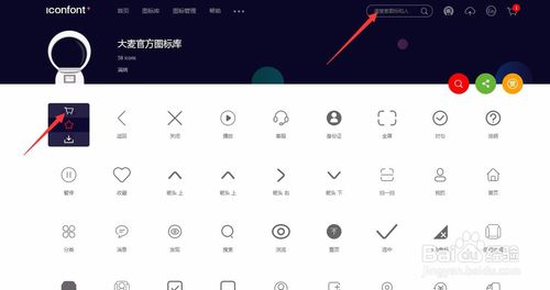 点击左上角的“图标”进入图标库,选择你喜欢的图标并加入购物车(鼠标经过鼠标会有三个按钮图标,分别是加入购物车,收藏,下载),你也可以在右上角的搜索框中输入你想要的图标名称。