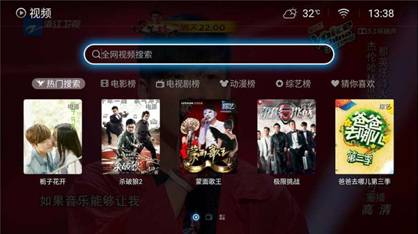 全视频TV桌面为你分享了精彩的直播,海量的视频,简洁的界面。方便快捷的操作,人性化的功能,只要你左右键轻轻上点,三大功能任您转换。