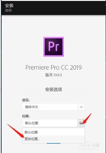弹出安装界面,点击文件夹小图标,然后选择“更改位置”