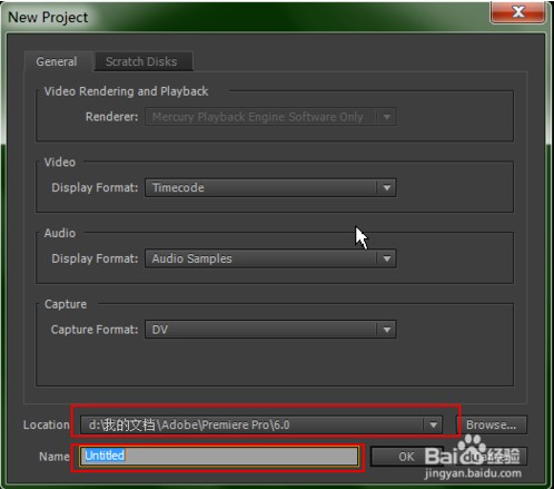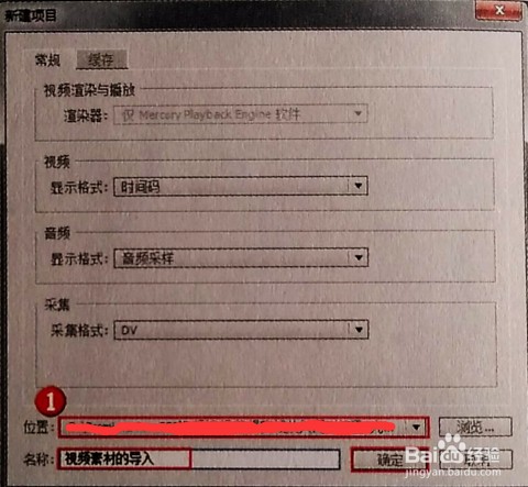 选择【常规】,确保【视频】的显示格式为【时间码】,【音频】的显示格式为【音频采样】,【采集】的格式为【DV】,接着选择项目保存的位置并对项目进行命名,然后单击【确定】按钮。保存的位置可以自行选择