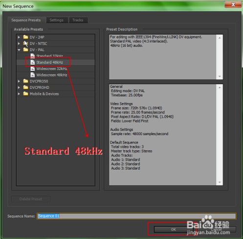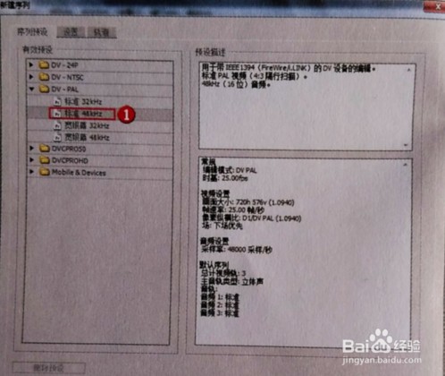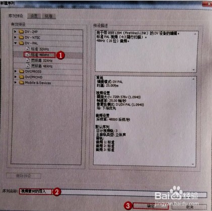 在这里我们选择的是DV_PAL选项下的 Standard 48kHz,选择的是视频编码模式与音频频率等,选上之后点击OK进入下一步。