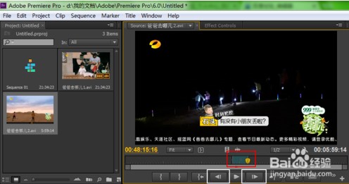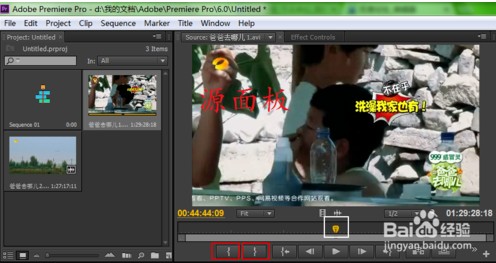 双击素材面板中《爸爸去哪儿1》,右边窗口“源面板”便会显示预览,在源面板中我们可以进行简单的视频剪辑和处理。现在我们先来看一下“源面板”上的按钮吧,圈住的分别是入点和出点;而白色方框圈住的是滑块,代表的是视频进度。