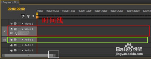 这时候,我们来看一下在源面板下方的时间线。Vidoe1表示视频轨道一,Audio1表示音频轨道1。我们只要把音视频分别拖到这里即可。另外需要注意的是:图中白色方框圈住的地方,按住拖动可以放大或缩小时间线,当剪辑的视频时间很长时,可以拖动来缩小轨道视图。