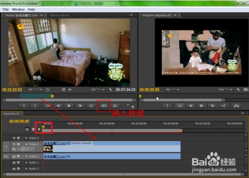 这样我们就成功地把《爸爸去哪儿1》的片段剪出来了,接着下来任务是要把《爸爸去哪儿2》的视频剪辑出来,并进行拼接。同理在素材面板双击《爸爸去哪儿2》,根据要剪辑的视频段,设置好入点和出点。当然,你也可以进行微调,图中白色方框圈住的分别是“滑块逐帧向前移动”和“滑块逐帧向后移动”,你可以多次点击来进行仔细调整。调整好之后跟刚才的操作一样,在时间线上把滑块移到之前剪辑好的视频后面,然后点击源面板上的“插入”按钮。这样我们就成功地把《爸爸去哪儿2》的片段拼接到《爸爸去哪儿1》的片段后面了,是不是很简单?