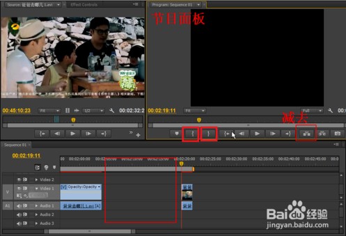 节目面板跟源面板差不多,同样具有入点和出点,那么这里的出点和入点分别有什么作用呢?在节目面板预览的时候,当你想去掉一段片段时,那就在这段片段的开始和结束处分别设置出入点吧。设置好了之后,点击图中“减去”按钮即可去掉片段。这时按住时间线上视频,可移动视频的具体位置,现在赶快把中间的空位挤掉吧。