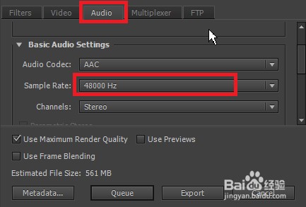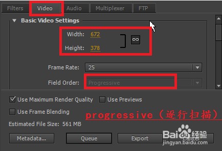 在图1设置视频参数,尽量设置为跟源素材一样大小,在数字上点击便可以输入数值,Field Rate设置为Progressive,其他保持默认值。在图2设置音频参数,音频频率要求相同,所以选择48000kHz。