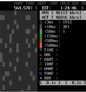 进入了硬盘扫描界面,每个长方块代表255个扇区(在LBA模式下)或代表63个扇区(在CHS模式下);扫描过程可随时按ESC键终止;方块从上到下依次表示从正常到异常,读写速度由快到慢。正常情况下,应该只出现第一个和第二个灰色方块;如果出现浅灰色方块(第三个方块),则代表该处读取耗时较多;如果出现绿色和褐色方块(第四个和第五个方块),则代表此处读取异常,但还未产生坏道;如果出现红色方块(第六个,即最后一个方块),则代表此处读取吃力,马上就要产生坏道;如果出现问号?,则表示此处读取错误,有严重物理坏道,无法修复。如果出现红色的X,则表示此处读取错误,有坏道,可以修复,也可以屏蔽。