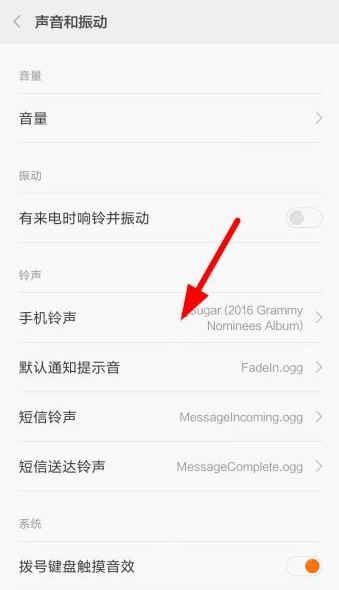 2、然后在声音和振动的位置里找到手机铃声,点击它!